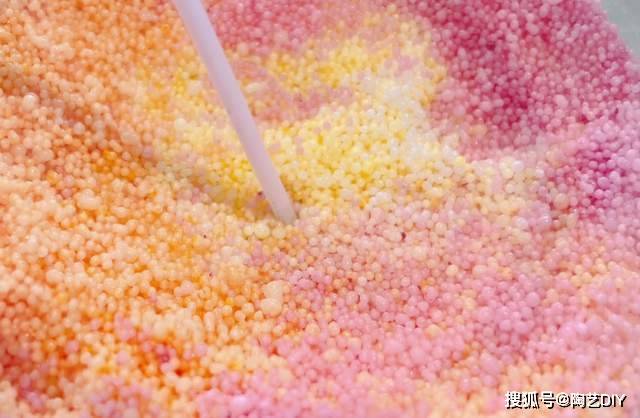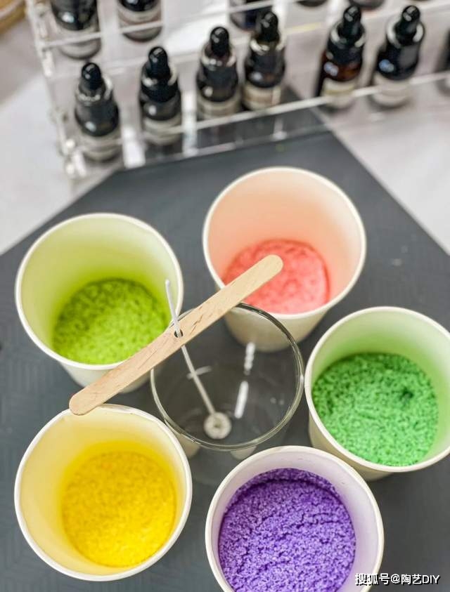 调配颜色时,需注意少量多次,可以先用牙签蘸取,然后伸入蜡粒中搅拌染色(PS:避免液体过多,来不及搅拌,导致蜡烛粒结块)。