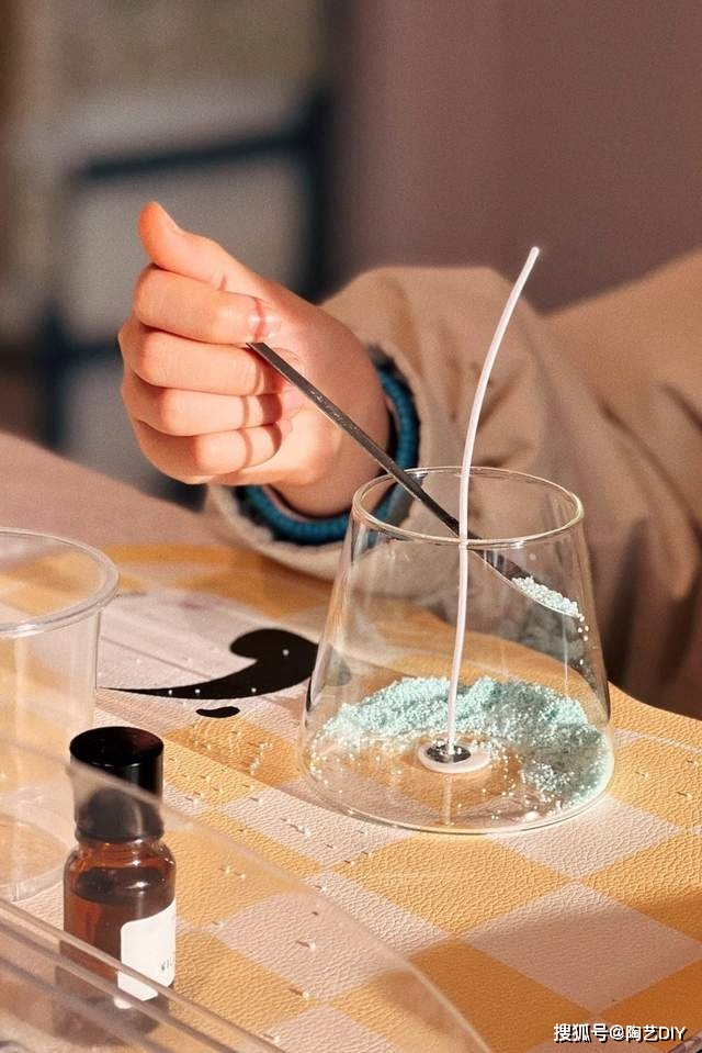 染色和精油调配好之后,先在玻璃杯中固定烛芯,之后再将调好色的蜡粒按照预想的画作,一点点加入杯中。