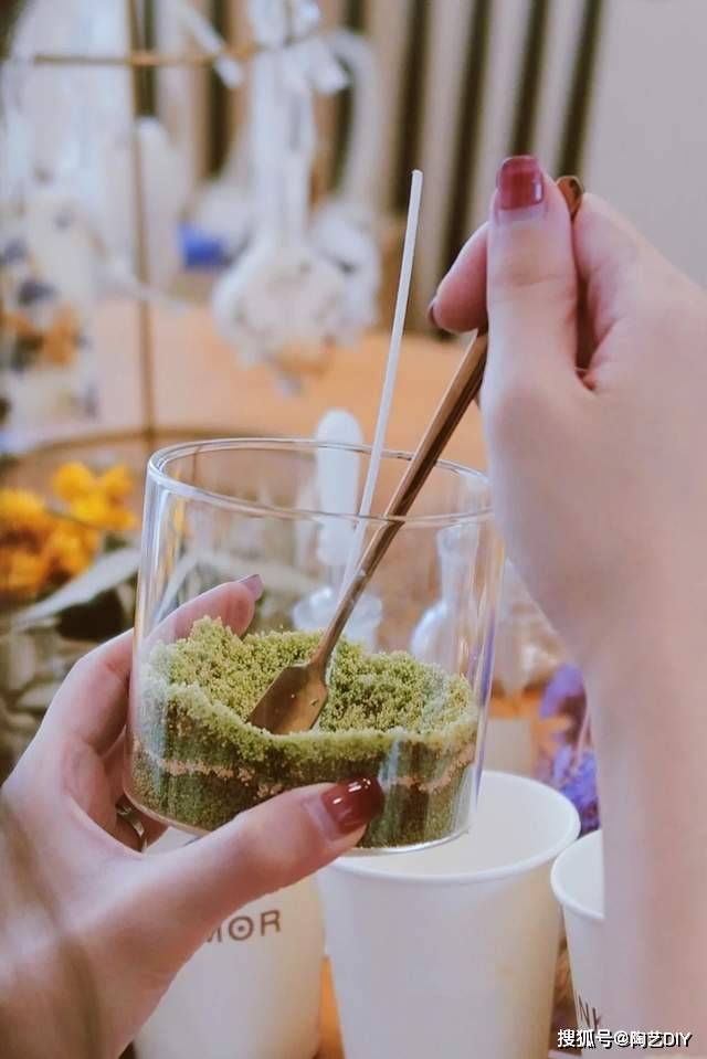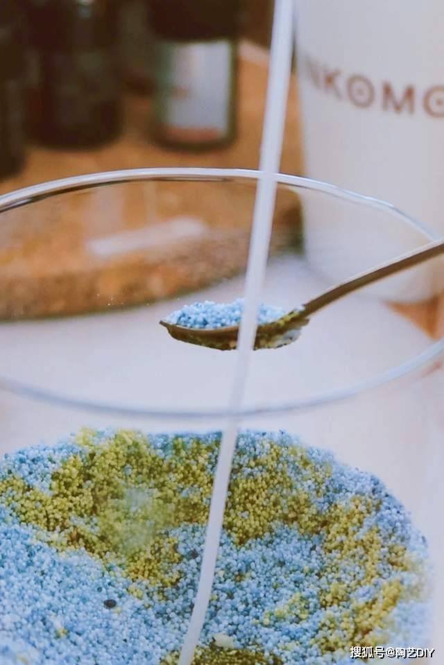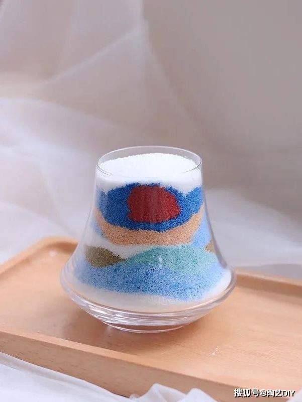 透明的玻璃杯,加上五彩的冰花蜡颗粒,随心的高低起伏,就像人生历程般渐渐呈现出一幅立体环绕的独特沙画之作。